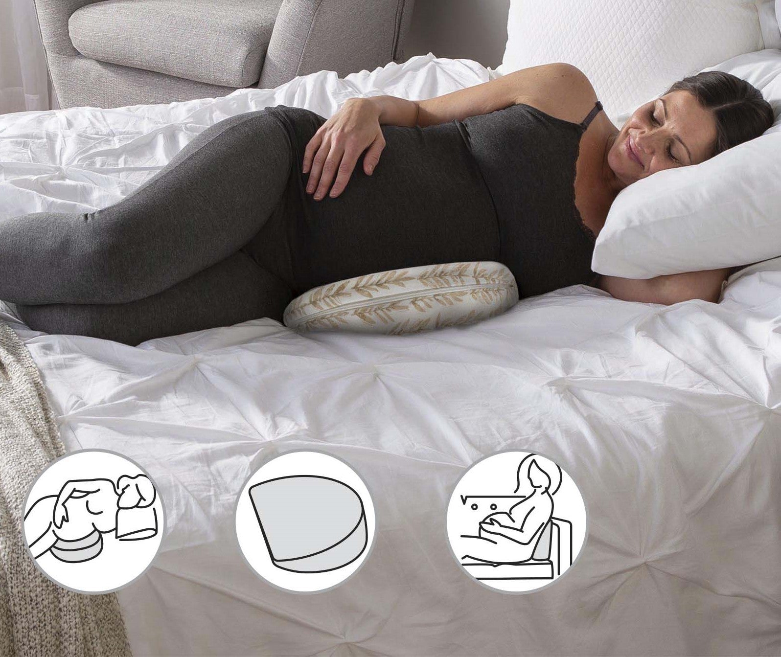 Firm pinpoint support pillow for mom pre-and post-birth. Covered in a soft, jersey cover, it provides pregnancy support where you need it. Small, but mighty, pillow for comfort!