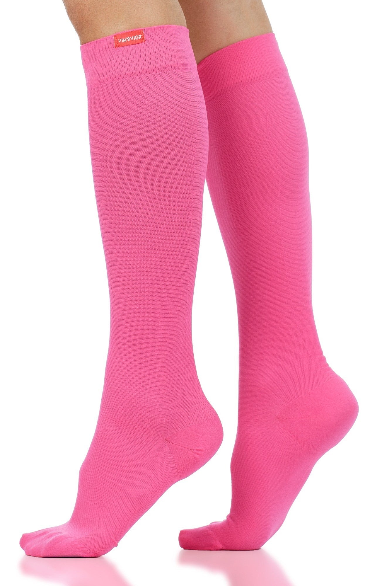 Vim & Vigr's signature knee high compression socks; Knit with specialized graduated compression technology, these socks stimulate blood flow back to the heart and boost circulation. The Moisture-Wick fabric draws excess sweat and moisture away from the skin to keep your feet dry. This technical fabric offers increased flexibility with its four-way stretch and ultra-light feel.